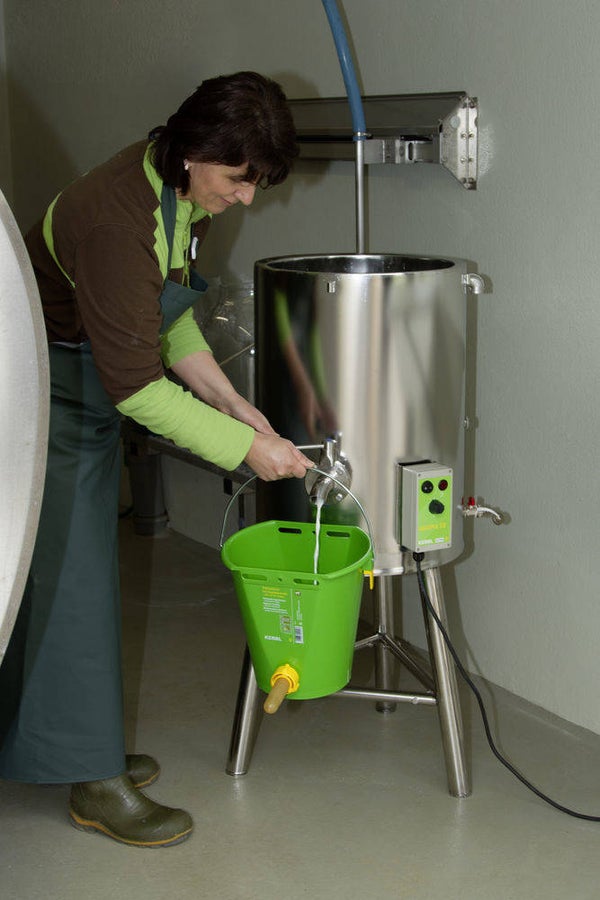 Vaktijdschriften en onderzoeken wijzen erop dat het voeren van jonge kalveren een merkbaar effect heeft op de gezondheid, de ontwikkeling en ook de latere prestaties van de dieren. Om hier positieve resultaten te behalen, dient de boer doorgaans te beschikken over een gefundeerde kennis en technische voorzieningen. Onze melkverwarmer biedt vooral voor middelgrote bedrijven de optimale ondersteuning tijdens de kalveropfok. Hij dicht de kloof tussen elektrische dompelaars en mobiele melktanks met een dure uitrusting. Snel en zonder veel moeite kunnen tot wel 50 liter melk of melkvervanger worden verwarmd. De melk wordt langzaam en zonder aan te branden via een waterbad verwarmd. De melkverwarmer is ook uitermate geschikt voor het pasteuriseren van melk.