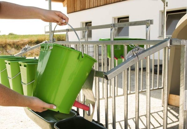 Les supports pour seaux et mangeoires longues sont compris dans la livraison. Seaux et mangeoires longues non compris dans la livraison.