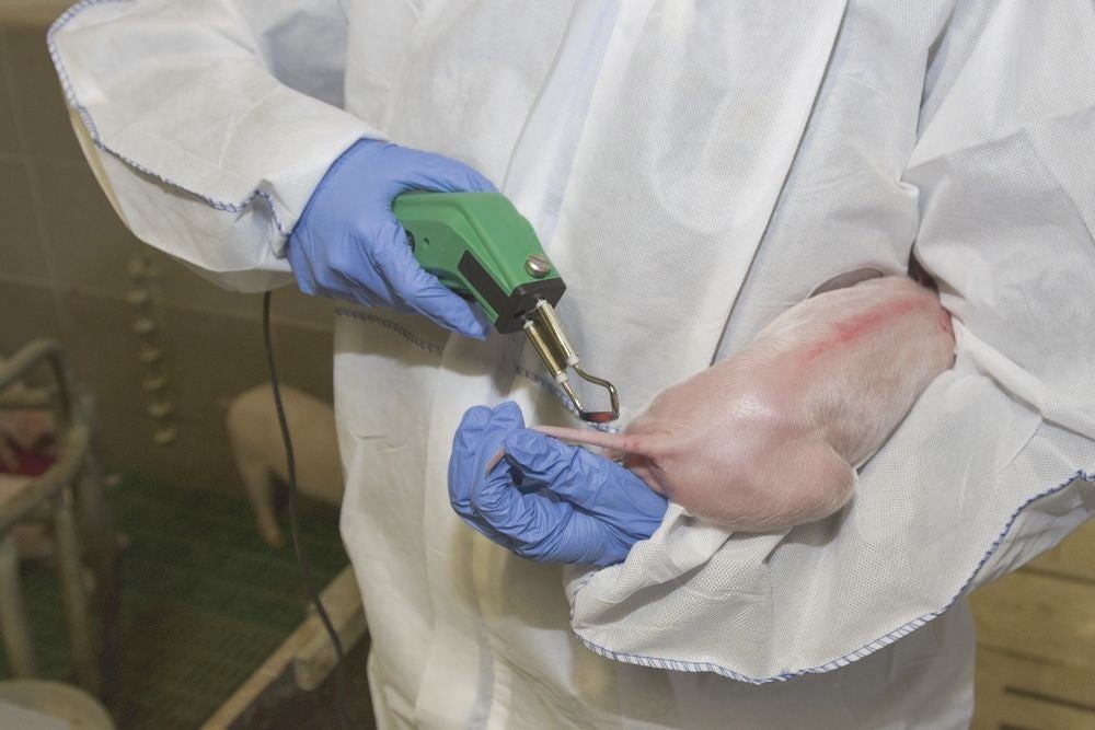 During tail docking the tails of newborn piglets are burnt off and by this the vessels close simultaneously. Pathogens cannot penetrate when the vessels are sealed immediately. Generally tails are docked to a length of 2 – 3 cm. The reason for tail docking is to avoid cannibalism among pigs that might take place if tails remain long during rearing and fattening.