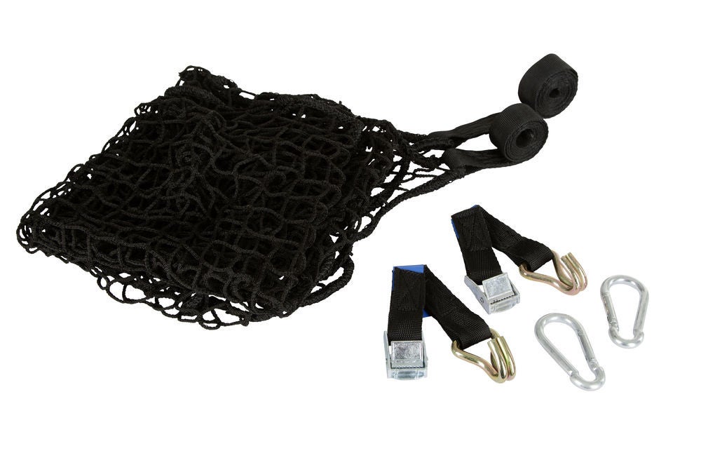 • La livraison inclut 2 mousquetons et 2 sangles : l'une des extrémités est fixée aux tirants PES du filet à l'aide d'un système de blocage et l'autre extrémité est fixée aux points d'ancrage du véhicule à l'aide de crochets pointus