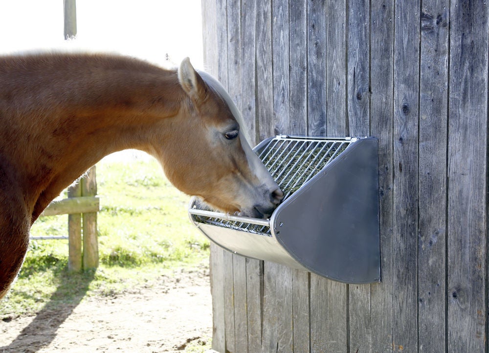 • tijdens het eten wordt het rooster door het draaischarnier tegen het voer gedrukt, zodat het paard kleinere porties aangeboden krijgt en langer bezig is