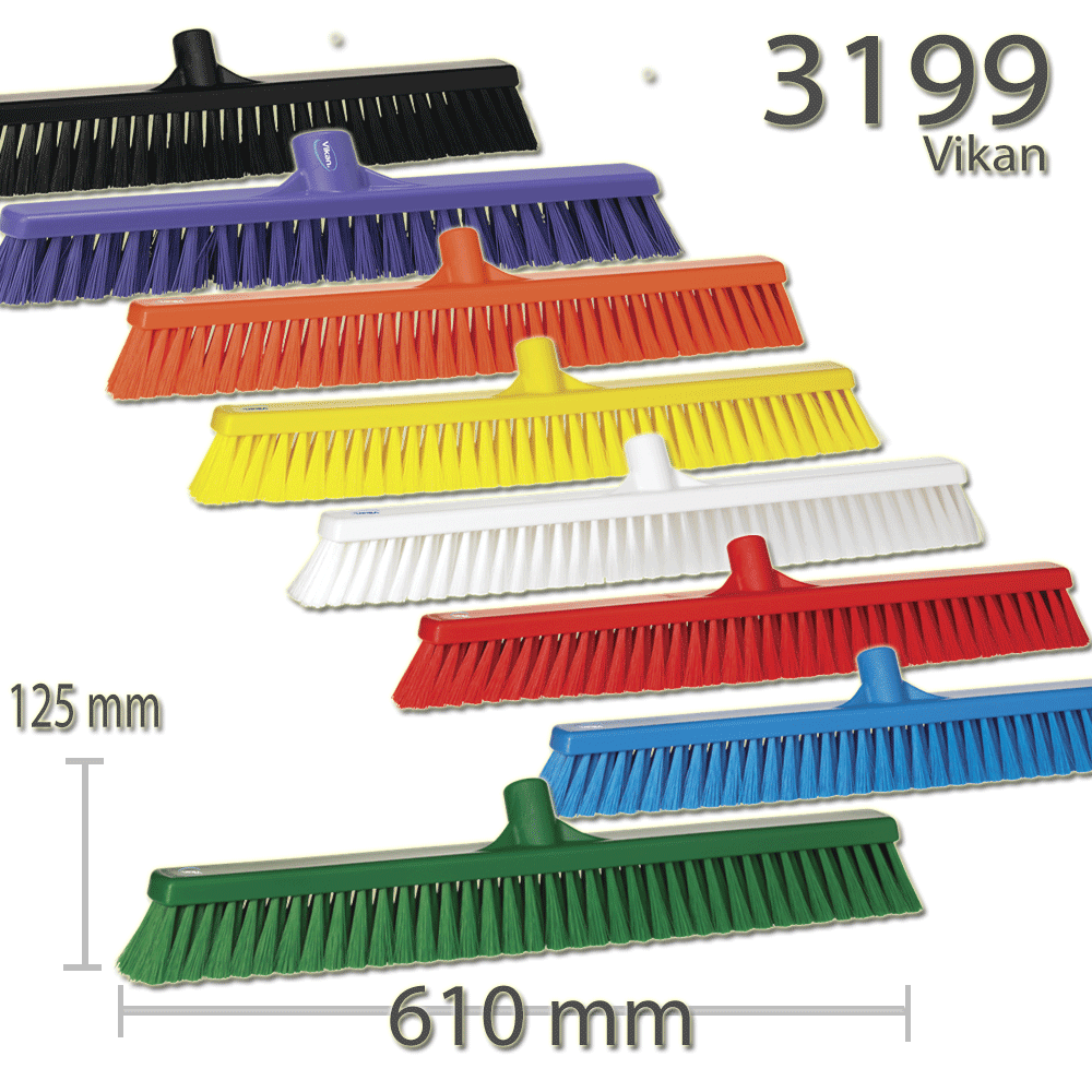 This floor broom is suitable for sweeping fine particles in large dry and damp areas. Use with any handle within the Vikan colour coded range.