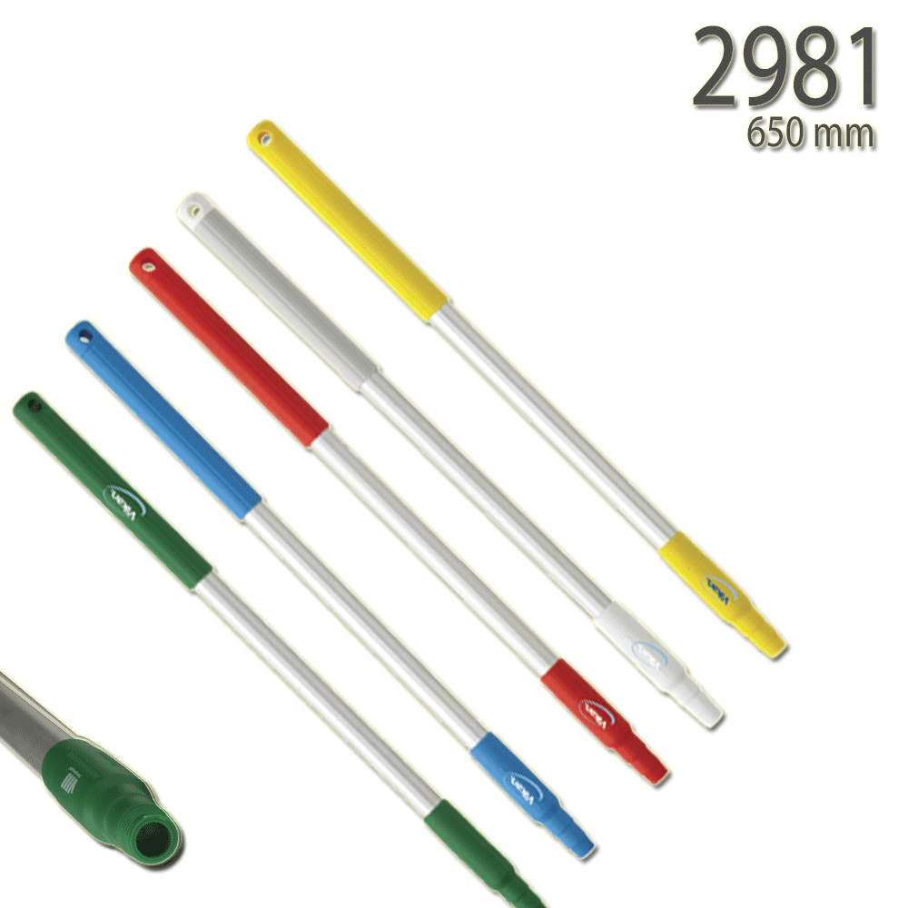Aluminium handle, ergonomically designed to improve the working position of the user with a comfortable grip, rounded top and hanger. Can be used for any tasks requiring a shorter handle such as cleaning conveyor belts, tables and small vats. Do not use this handle with acid or chlorine.
