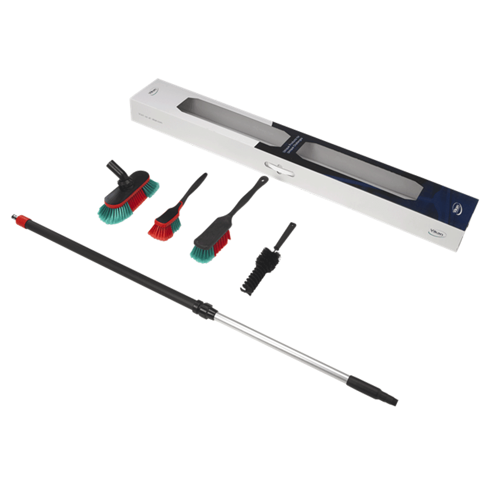 Kit de démarrage Vikan transport system. Le Kit de démarrage comprend les références suivantes : 1 brosse manche long 522252, 1 brosse à main 525252, 1 brosse à passage d'eau souple 526852, 1 brosse à jante souple 525052 , 1 Manche en aluminium télescopique à passage d'eau avec système de clic, 1600 mm.