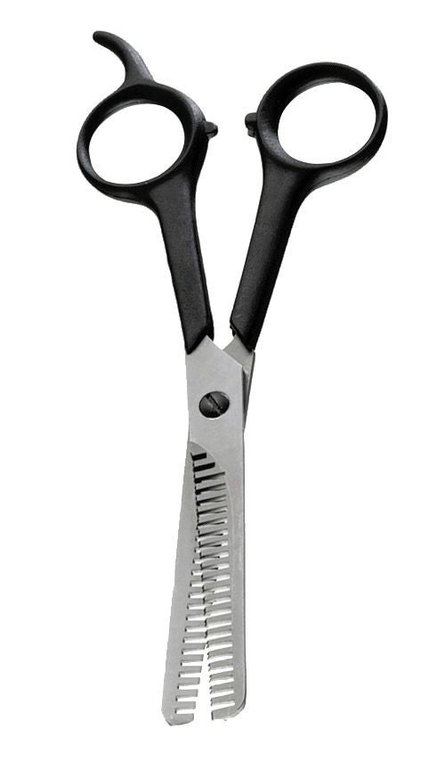 Zweiseitige gezähnte Effilierschere aus Metall, ideal zum Ausdünnen und Schneiden von dichtem Haar. Durch den praktischen Fingerhaken und Kunststoffgriff liegt die Schere gut in der Hand und sorgt für einen perfekten Schnitt. Schnittlänge 6 cm