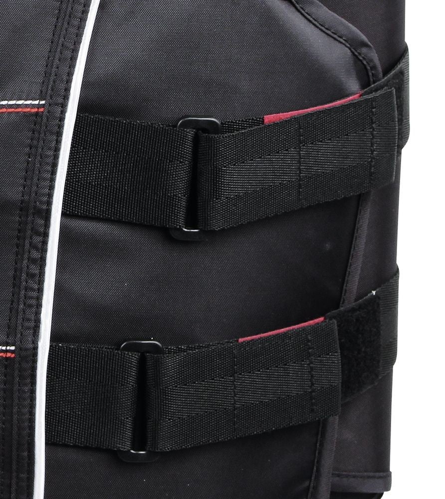 • adjustable with hook-and-loop fasteners at the shoulders and waist