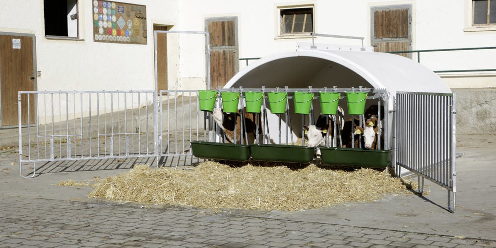 Het grote kalverhok, gemaakt van met glasvezel versterkt kunststof, biedt plaats aan maximaal 5 kalveren (hou u aan de lokale richtlijnen voor dierenbescherming). Het schuifraam aan de achterkant maakt het onder andere gemakkelijk om de dieren in de gaten te houden en het optionele hooirek te vullen. Het extra versterkingsframe rondom het kalverhok garandeert een grotere stabiliteit. Het kalverhok met omheining biedt een optimaal overzicht en zorgt voor een betere controle van de dieren.