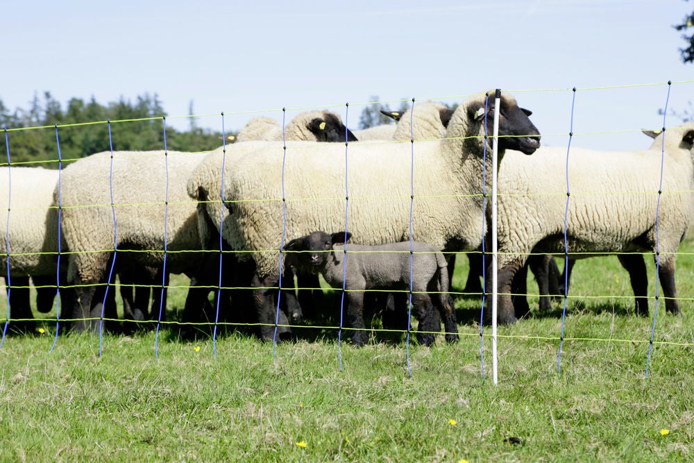aansluitmogelijkheden voor professioneel gebruik in de schapenhouderij. In verticale lijn zijn stijve kunststof stijlen