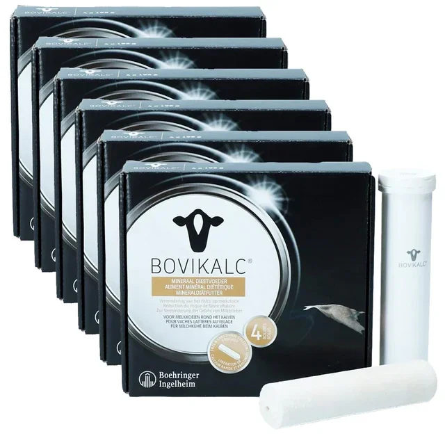 Bovikalc calcium bolus is een aanvullend dieetvoeder, ter voorkoming van of nabehandeling van melkziekte. Bovikalc wordt zowel preventief als ter aanvulling van een calcium infuus aangeraden. Zeer veilig in gebruik, unieke samenstelling en toedieningswijze. Door de bijzondere samenstelling van Bovikalc komt de calcium zowel onmiddellijk als ook geleidelijk beschikbaar. Ter voorkoming van of nabehandeling van melkziekte. Voor preventieve toediening van calcium bij koeien die gevoelig zijn voor melkziekte. Gebruik Bovikalc ter aanvulling van het rantsoen rond de partus bij koeien die gepredisponeerd zijn voor hypocalcemie (melk- of kalf ziekte).