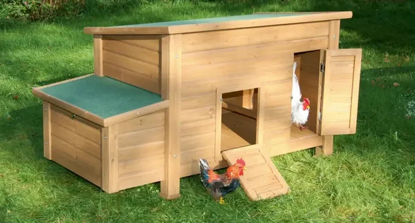 - Met legnesten en zitstokken: de zijaanbouw biedt twee legnesten. De legnesten en de twee zitstokken bieden voldoende ruimte om te rusten en eieren te leggen – voor een comfortabele huisvesting.