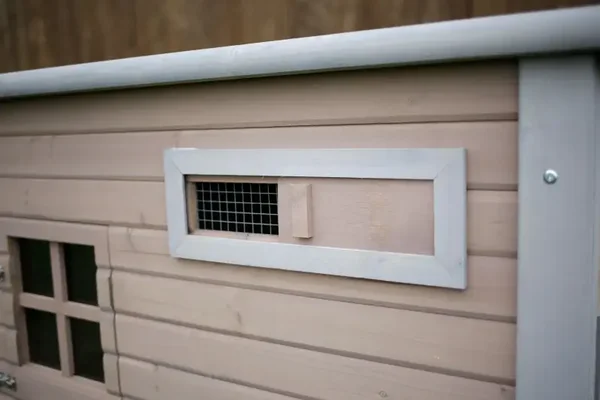 - Fenêtre coulissante pour l’apport d’air frais : La fenêtre coulissante intégrée permet de réguler la circulation de l’air individuellement et se porte donc garante d’un climat toujours sain dans le poulailler.