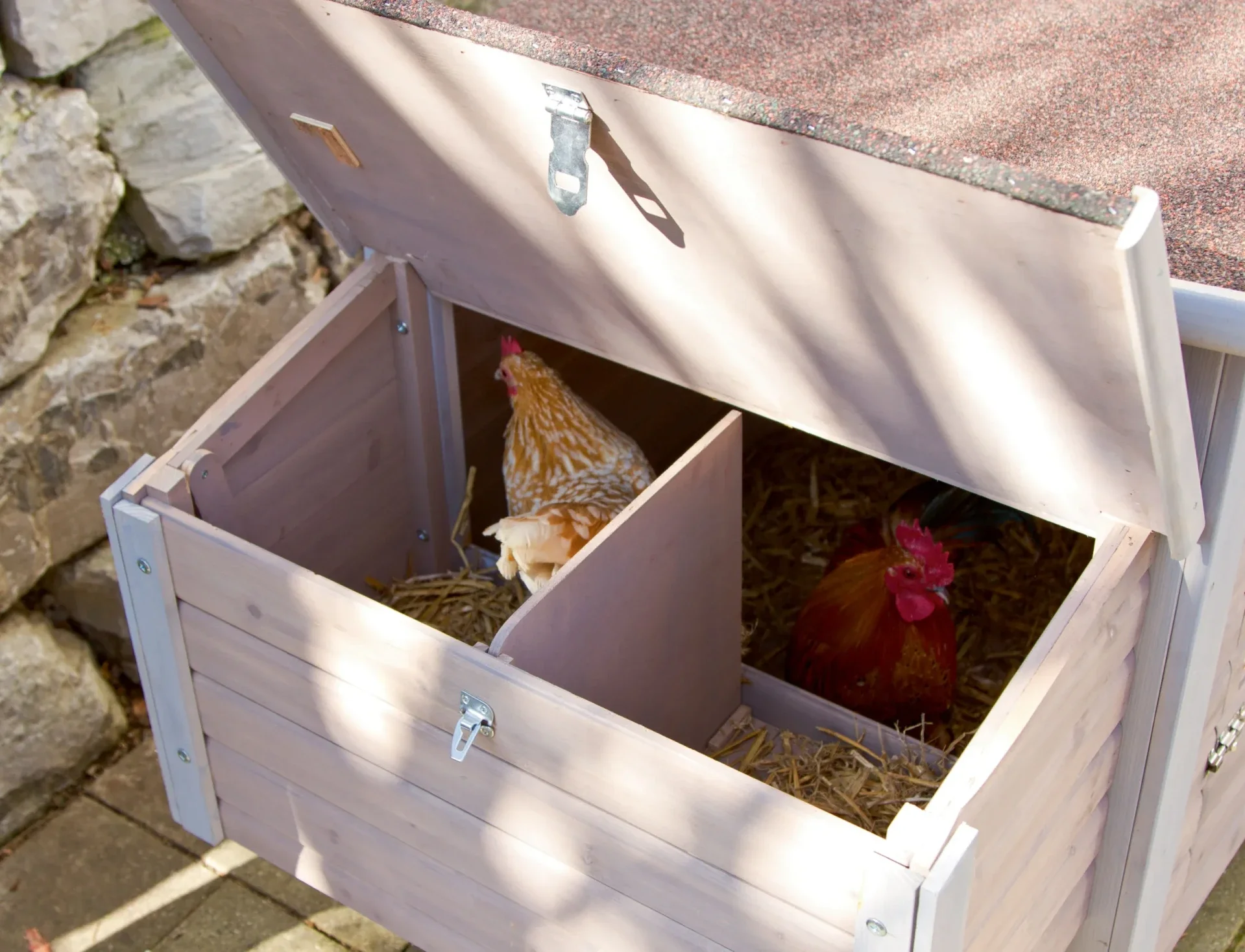 - Verhoogde aanbouw met 2 legnesten en zitstokken: De praktische aanbouw biedt kippen een beschutte plek om eieren te leggen en comfortabele zitstokken om 's nachts te slapen.