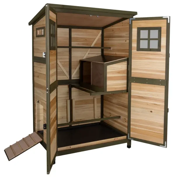 - Espace et matériaux : le poulailler peut accueillir jusqu'à 10 poules et est fabriqué en bois insensible aux intempéries. Des fenêtres permettent aux poules de suivre un rythme jour-nuit naturel et favorisent une bonne santé.