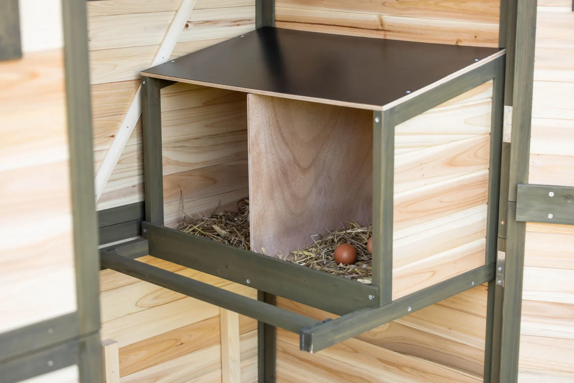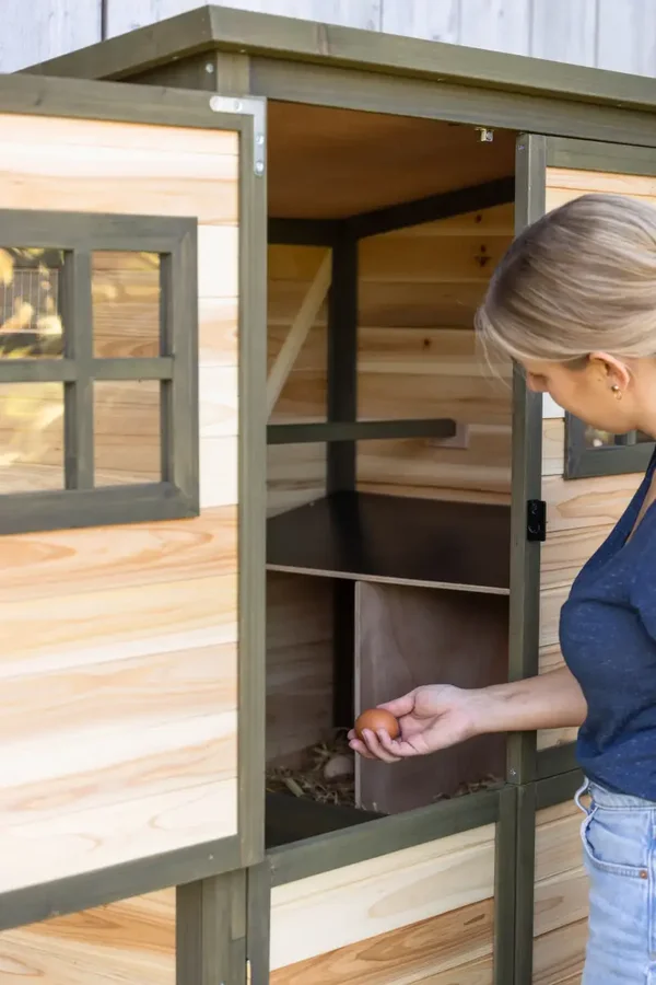 - Ruimte en materiaal: het kippenhok biedt plaats aan tot wel 10 kippen en is gemaakt van weerbestendig hout. Kijkvensters zorgen ervoor dat kippen een natuurlijk dag-nachtritme hebben en bevorderen een gezonde houding.