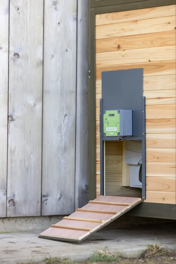 - Flexibilité et extension : une porte latérale permet d'installer un enclos extérieur ou un filet pour poules. Le poulailler est prééquipé pour accueillir les abreuvoirs SmartCoop, les nourrisseurs automatiques SmartCoop et diverses portes automatiques de poulailler.